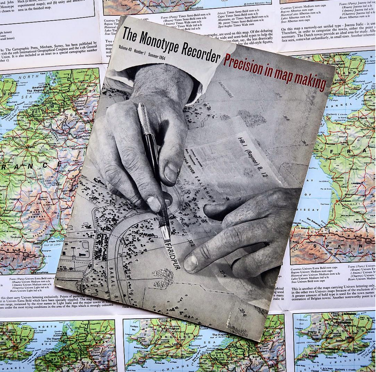 I had a lunchtime wander through a recent Oxfam purchase: The Monotype Recorder (Volume 43, Number 1, Summer 1964 - Precision in map making). This mag was 'sent gratis to every printing office with 'Monotype' machines.' Or you could buy it for five shillings.